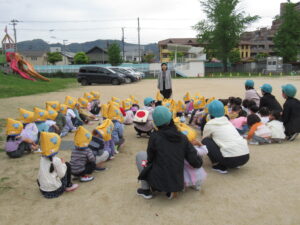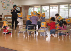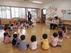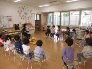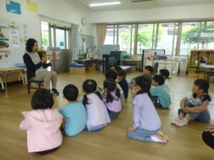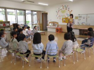 避難訓練終了後はそれぞれのお部屋に戻り、絵本や紙芝居で先生のお話を聞きました。