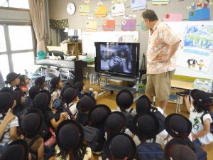 砥部動物園の写真を見ていた年長さんのお部屋に、ピーター先生がやってきました。