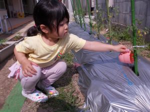 年中さんは、裏の畑に植えた野菜に水遣りをしています。
