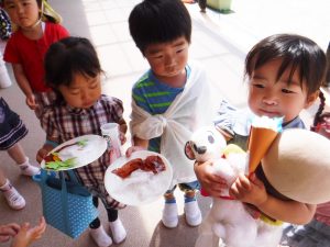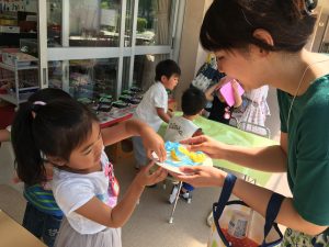 5月17日 金曜日。今日も暑い日です。暑い日を楽しむかのように、赤組さんのテラス前では、冷たくておいしそうなアイス屋さんが開店していました。
