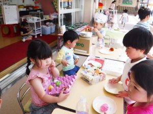 赤組さんが席を離れると、買い物を楽しんだ年少さんたちが、「今度は自分たちの番だ!」とばかりに、お店屋さんで遊び始めました。
