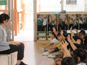 外や中で遊んでいた子は、まず近くの先生の元に集まります。
