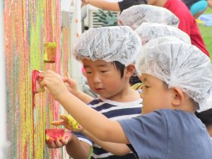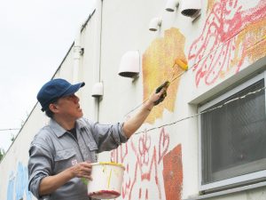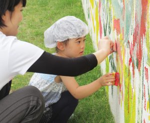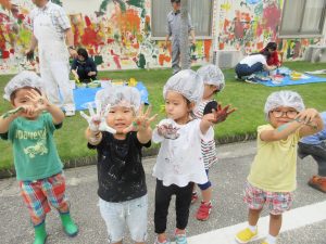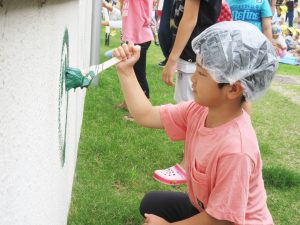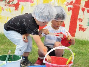 コロコロ、ペタッ、ポンッ、シュッ・・・いろんな道具を持って、園舎に絵を描いたり色を付けたりしました。