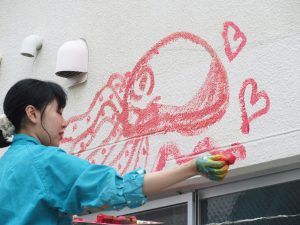 子どもたちが絵を描き終えた後、愛媛大学から来た先生と大学生のお姉さん達が、手が届かない高いところに絵を描いてくれました。