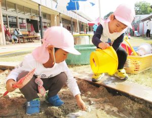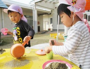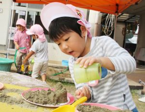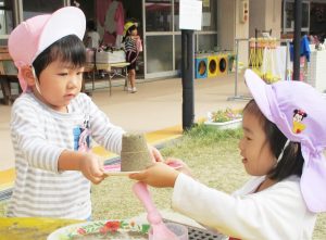 すぐに形が壊れるのですが、子どもたちにとっては、カップに砂を入れて押し固め、お皿にひっくり返してお客さんにお出しする・・・。
