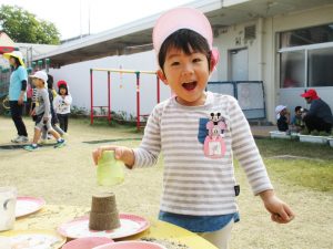 それを見ていた友達が、コップに砂を入れてプリンを作ってみます。形がきれいにまとまって、思わず笑顔!