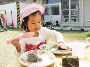 乾いた砂を使うより、お友達が水を撒いてた砂の方がプリンやホットケーキを上手く作れました。