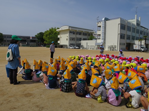 本年度初めての避難訓練では、地震を想定し、先生の誘導に従って避難しました。年長さんは、これまでの経験から防災頭巾を被って避難場所に移動しました。子どもたちは、いつもと違う雰囲気に緊張していました。