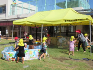 西園庭にはビニールプールが出ていて、年中さんが大喜び。