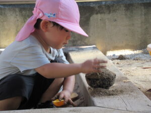 桃組さんの砂場では、教育実習のお姉さん先生とお山を作っています。