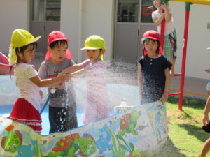 お着替えとタオルがあれば、園庭で水遊びができますね。