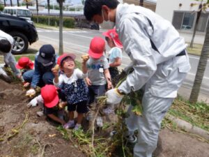 年長児と年少児が力を合わせて抜きます。「うんとこしょ、どっこいしょ」