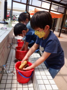 年長児の保育室前をのぞくと、先ほど収穫したお芋を洗っています。