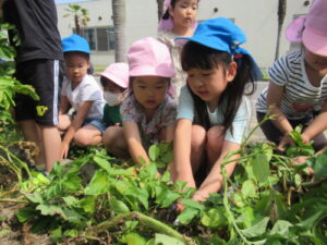 年中児は、5月に苗を植えたキュウリやトマトなどの夏野菜のお世話もしました。附属高校生が優しく教えてくれました。