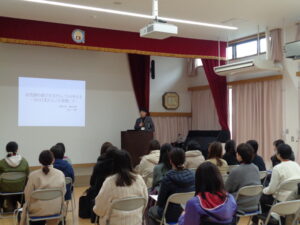 まず、光るどろだんごづくりに夢中になっている保育園の幼児さんと保育士さんたちや、その保育園に関わっている大学の先生の研究をまとめた番組を視聴し、その後、浅川先生の講義を拝聴しました。「子供が一つのことに夢中になる凄さ、凄み。そのような場面では、大人でもかなわないような集中力を発揮し、そのことを探究し続ける姿が見られます。大切なことは、『熱中』の中で何をやったか、何を経験したかということよりも、熱中し探究し続ける経験そのものです。幼児期の子供にとってこのことが非常に重要だろう。」とお話くださいました。