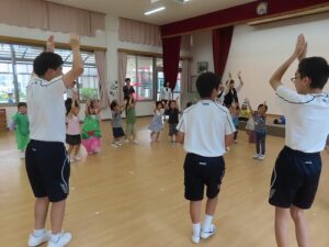 6月10日(火)、附属特別支援学校中学部のお兄さん、お姉さんが幼稚園に遊びに来てくれました。初めて会ったお兄さん、お姉さんだったので、初めは少しドキドキ。でも、楽しいダンスを教えてもらって一緒に踊り始めると、だんだん楽しくなってきました。「はとぽっぽ体操」「Head Shoulders Knees & Toes」「Hokey Pokey 」と、教えてもらいながら一緒に踊って気持ちがほぐれていき、最後に去年の幼稚園の運動会で踊った「アララの呪文」が流れると、みんな笑顔で踊りました。「また、遊ぼうね。」「特別支援学校に遊びに行くね。」と言ってお別れをしました。