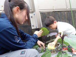 6月11日(水)、附属高校のお兄さん、お姉さんが来てくれました。5月には土に栄養を入れてくれ、うねをつくってくれて、そこに一緒に野菜の苗を植えましたが、今回は、野菜がもっと元気になるように、肥料をあげました。「野菜のすぐ近くにあげると、元気がなくなるから、少し離れたところにあげてね」と、お兄さんの説明を聞き、お兄さん、お姉さんと一緒に肥料をあげました。みんなが肥料をあげた後は、遊戯室で転がしドッジボールをして一緒に遊びました。お姉さんの手を引いて逃げ回っている子もいました。来月にはお野菜が取れるかな?一緒に収穫するのが楽しみですね。