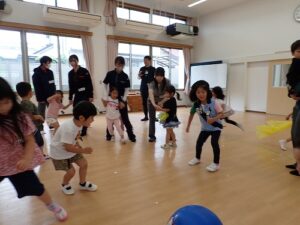 年中児が附属特別支援学校と附属高校との交流活動を楽しんでいます。