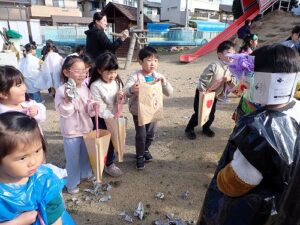 園庭では、かわいい鬼たちが待ち受けていました。鬼にめがけて「鬼は外!福は内!」と言って豆を投げました。